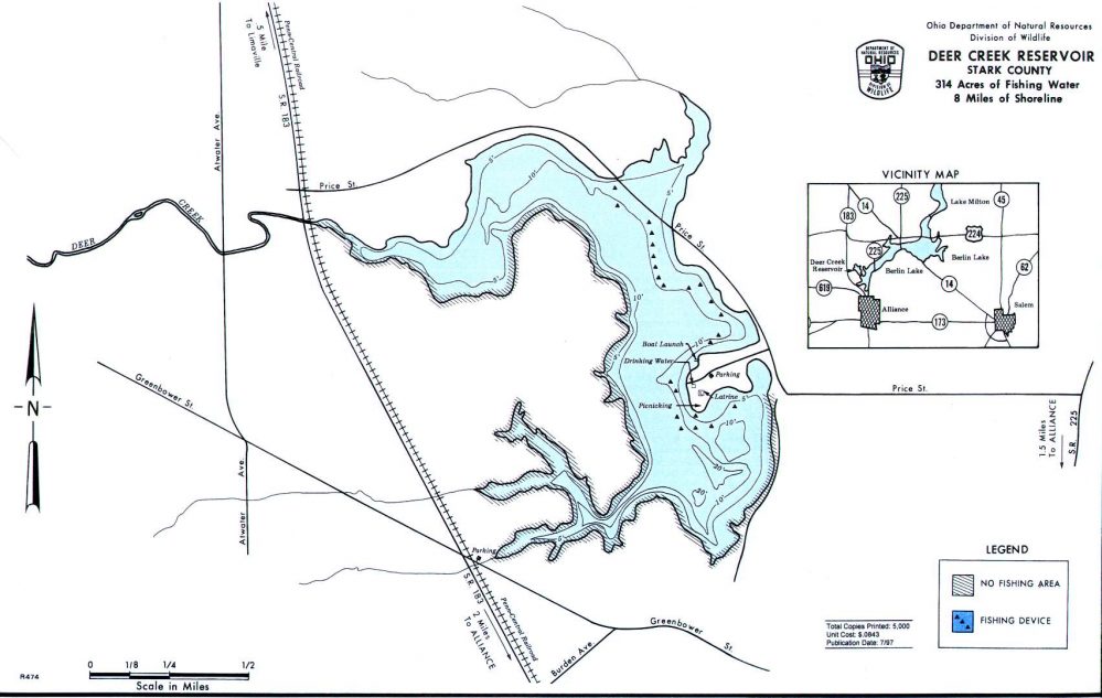 Deer Creek Reservoir is in Stark County. The lake covers 314 acres of fishing water with 8 miles of shoreline. It is within Ohio Division of Wildlife District Three.