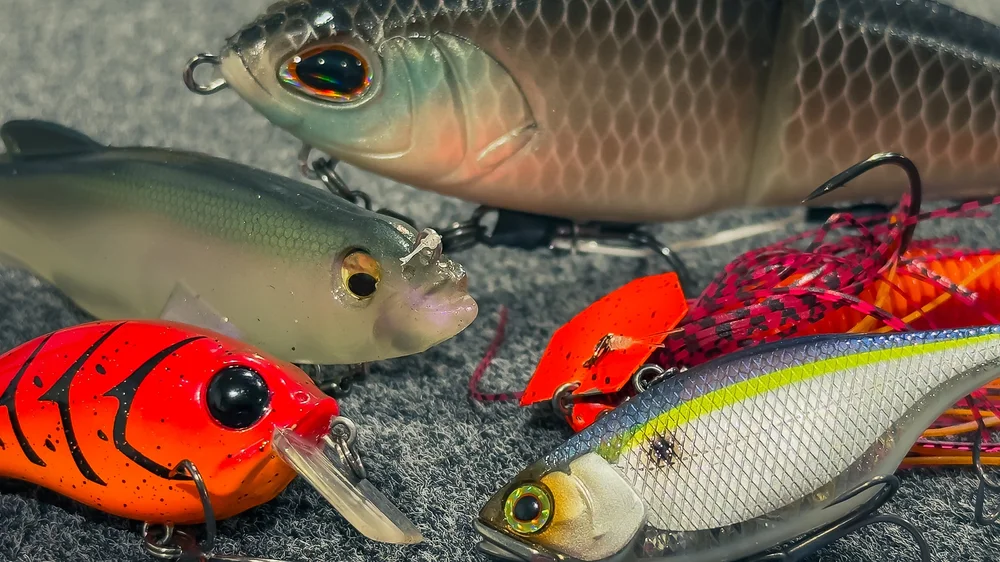 Bass can be caught on a mix of fast moving reaction baits and slow, bottom contact presentations. When it comes to reaction baits, we focus on details that make our baits stand out. We’re using baits with flash, vibration, and sound to get the bass’ attention. When it comes to soft baits, it’s all about a natural presentation. We find that baits with some blue in them will often catch more fish than other colors.